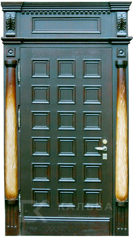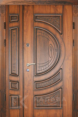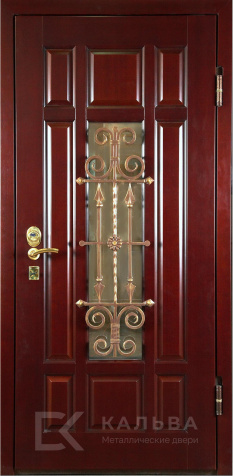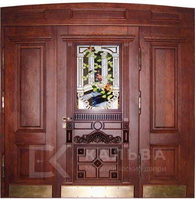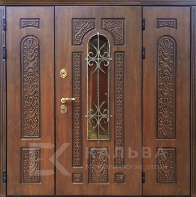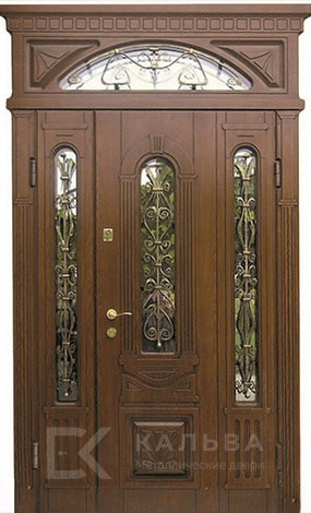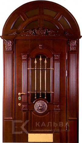 Фото «Входная двустворчатая дверь орех с круговым остеклением и ковкой №101»